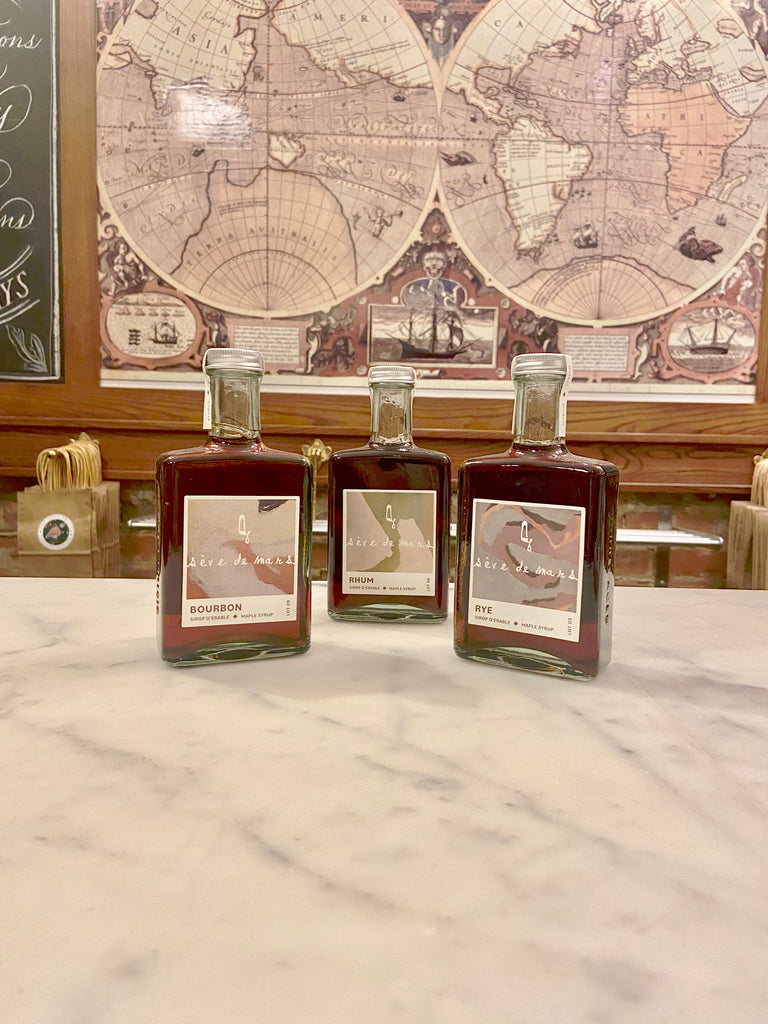 Aged in oak barrels that once held exceptional rye, this opulent syrup offers spicy notes of grilled almonds, studded with aromas of cloves and white peppercorn.  With its golden red colour,  it evokes warmth, nature, and sophistication. . Its signature flavour is reminiscent of a bright spring day when the sun warms up the thawing forest floor. Perfect for decadent brunches, desserts, and a hot toddy!
